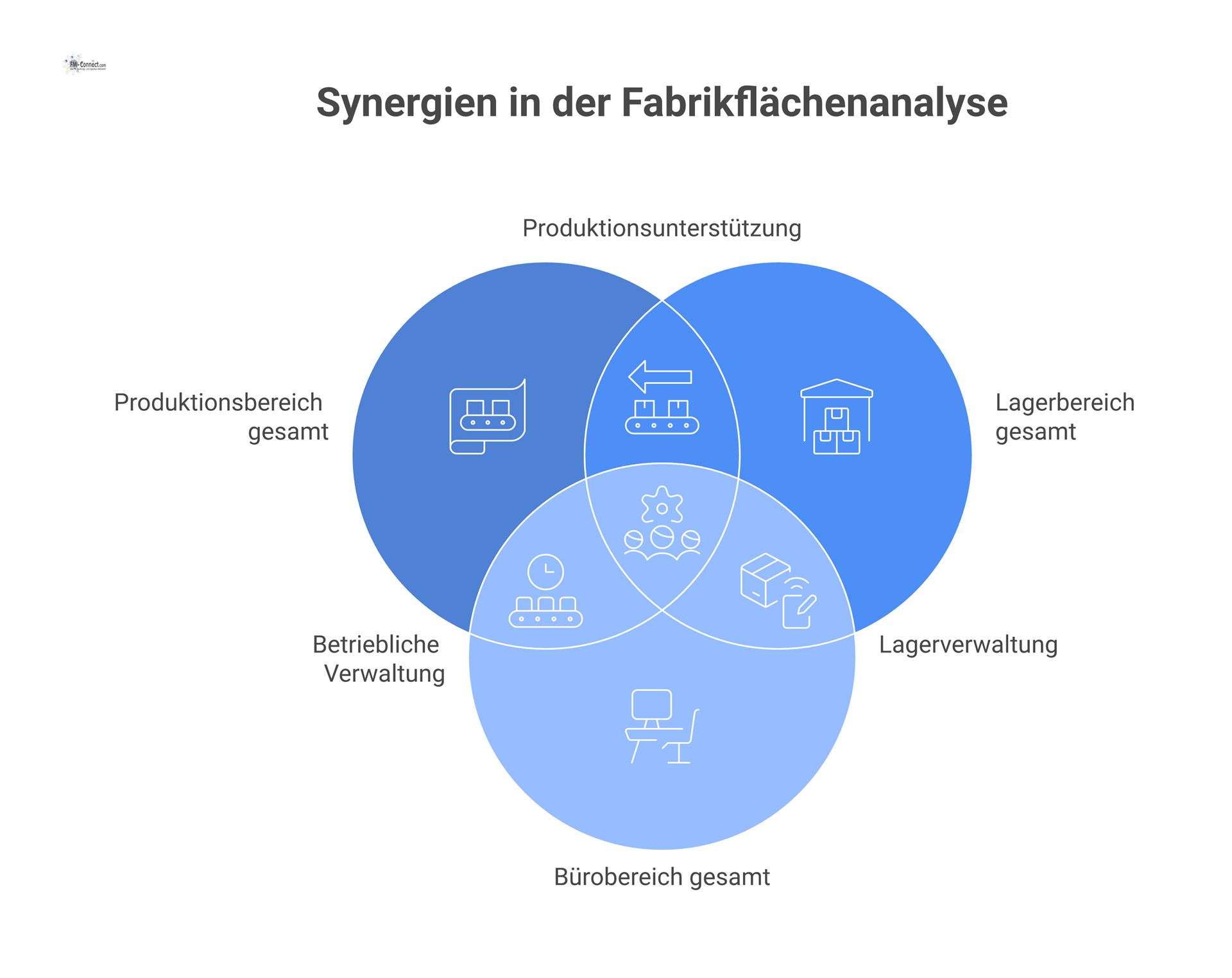 Innerhalb dieser Blöcke überlappen sich Teilflächen, sodass im Produktionsbereich beispielsweise auch Lager- und Büroflächen enthalten sind. Dies gewährleistet, dass die spezifischen Beziehungen dieser Flächen, wie zum Beispiel produktionsnahe Zwischenlagerflächen, in der späteren Flächenanalyse erkennbar bleiben.