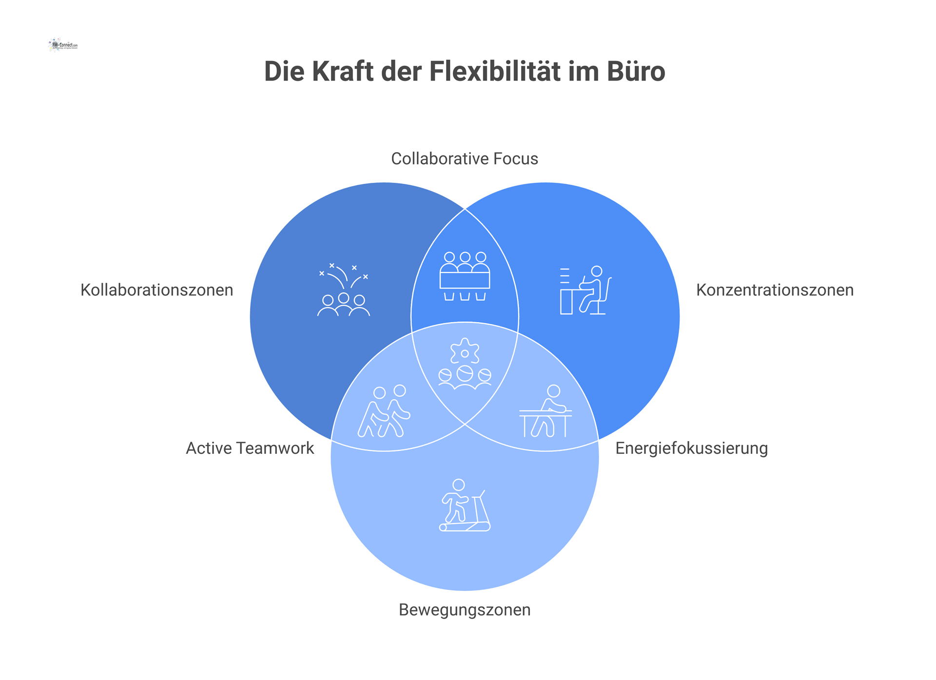 ABW bedeutet in der Umsetzung, Mitarbeitern wechselnde Arbeitsumgebungen bereitzustellen, die je nach Aufgabe das richtige und unterstützende Umfeld bieten. Starre Raumstrukturen lösen sich auf, die Anforderungen richten sich nach den jeweiligen Tätigkeiten. Jeder wählt die für die Aufgabe und seine Bedürfnisse richtige Umgebung aus, die er auch mehrmals wieder wechseln kann. Dafür können ganz unterschiedliche Bereiche im Unternehmen genutzt werden, wie beispielsweise Mittelzonen, Gemeinschaftsbereiche, Work Cafes, Projekt- und Konferenzzonen, Rückzugsbereiche und Teamflächen.
